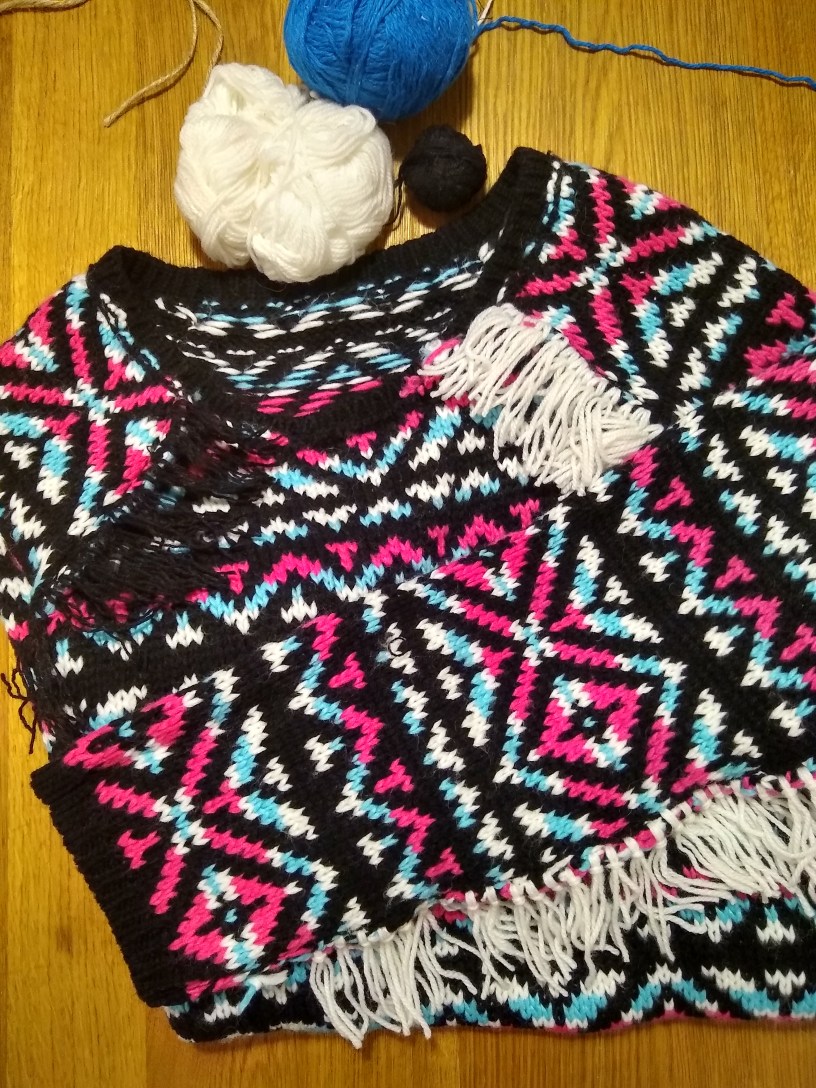 Znalazłam w moich zapasach pasujące kolory włóczki, pocięłam na małe kawałki i w miejscu widocznych szwów zrobiłam frędzle.