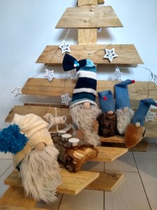 wszystkie krasnale mają tułowie zrobione ze skarpet wypchanych kamykami i związanych na górze, nosy z kawałka materiału wypchanego ścinkami. Nic nie było szyte, wszystkie elementy połączone ze sobą klejem na gorąco.