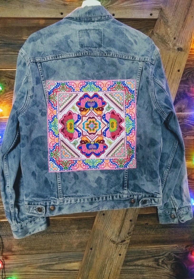 Po wyschnięciu i wypracowaniu, naszyłam na plecy wstawkę z haftu. Jest do kupienia na