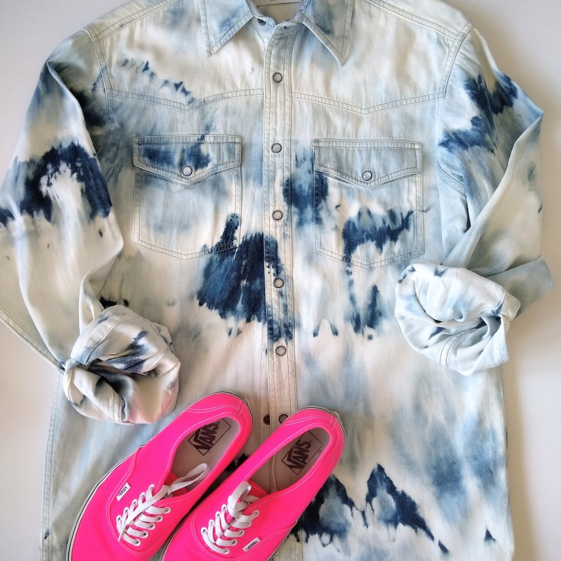 Cieszę się bardzo, że wróciła moda na tie dye. I znów dżins daje nam ogromne możliwości. W ulubionym sklepie wpadła mi w ręce niepozorna koszula dżinsowa w ciemnoniebiesko burym kolorze. Idealna do odbarwienia w Ace, cienki dżins łatwo można ugnieść i pościskać gumkami recepturami. Tworzymy pewnego rodzaju kokon, i teraz wrzucamy do miski plastikowej i polewamy Ace.
