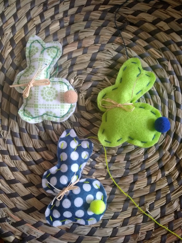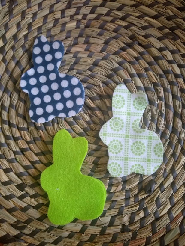 Po wycięciu najprostszego motywu z królikiem, z podwójnie złożonego filcu, trzeba go zszyć muliną w kontrastowym kolorze i wypchać od środka pianką do poduszek.