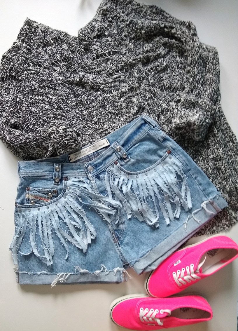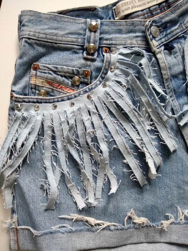 Przymocowanie frędzli do spodenek, to zasługa ćwieków. Przebijając dżins dłutem do nap robimy dziurki przez które nabijamy ćwieki i oszczędzamy sobie trudu ręcznego przyszywania.