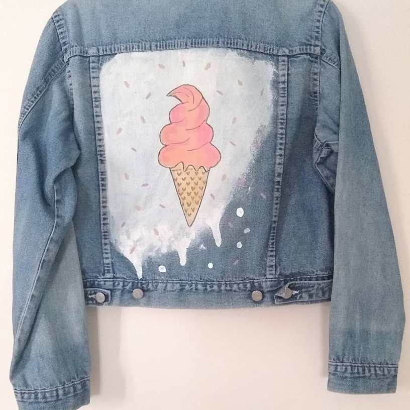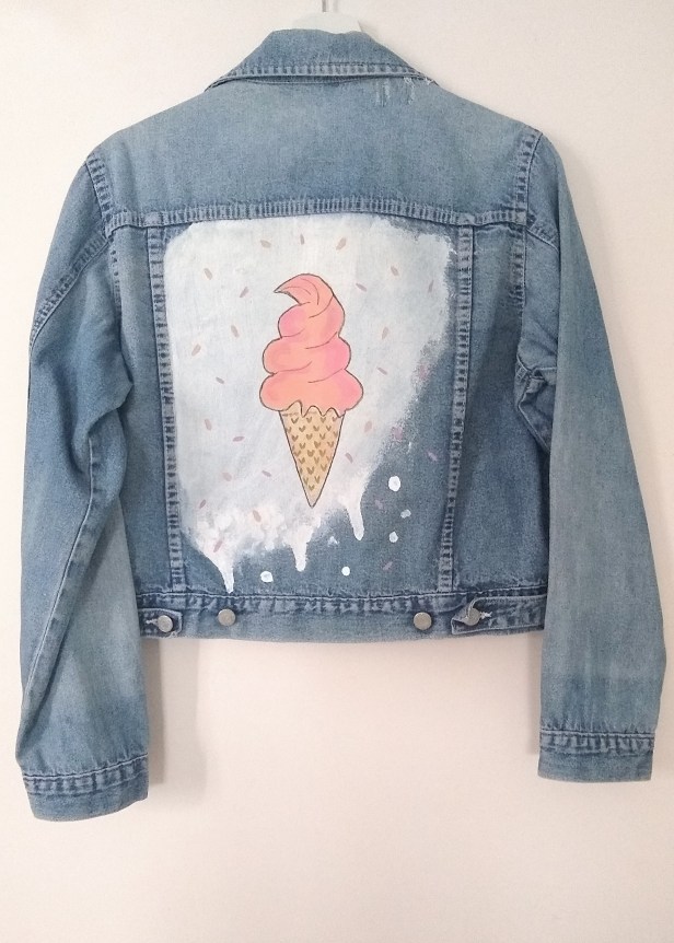 Lody w wersji denimowej, czyli uczę się malować na tkaninie. Wzór jest prosty, najpierw malujemy tło, tutaj użyłam farb produkcji rodzimej firmy Profil z Krakowa. Polecam, bo są idealnie gęste i gotowe do malowania od razu po otwarciu słoiczka. Czekamy aż wartwa farby wyschnie i malujemy dalej. Dowolność kolorów, zależy jakie kto lubi lody? 😁 I pamiętajmy o utrwaleniu farby po dokładnym wyschnięciu, czyli po 24 godzinach.