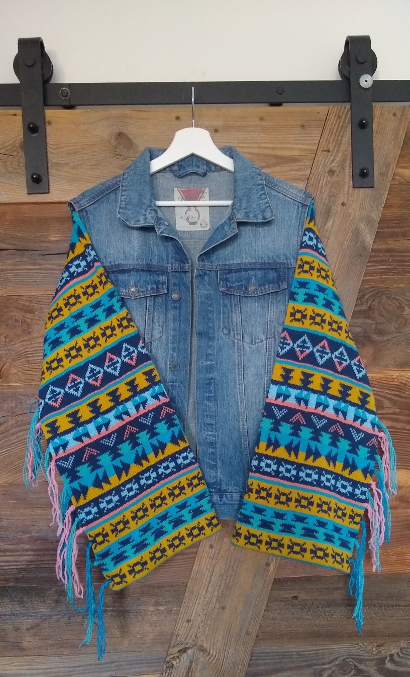 Katana uszyta z kamizelki i wzorzystego szala, czyli denim w wersji dzianinowej. Frędzle dorobione ręcznie. Zimowa propozycja na ciepły dżins 🙃