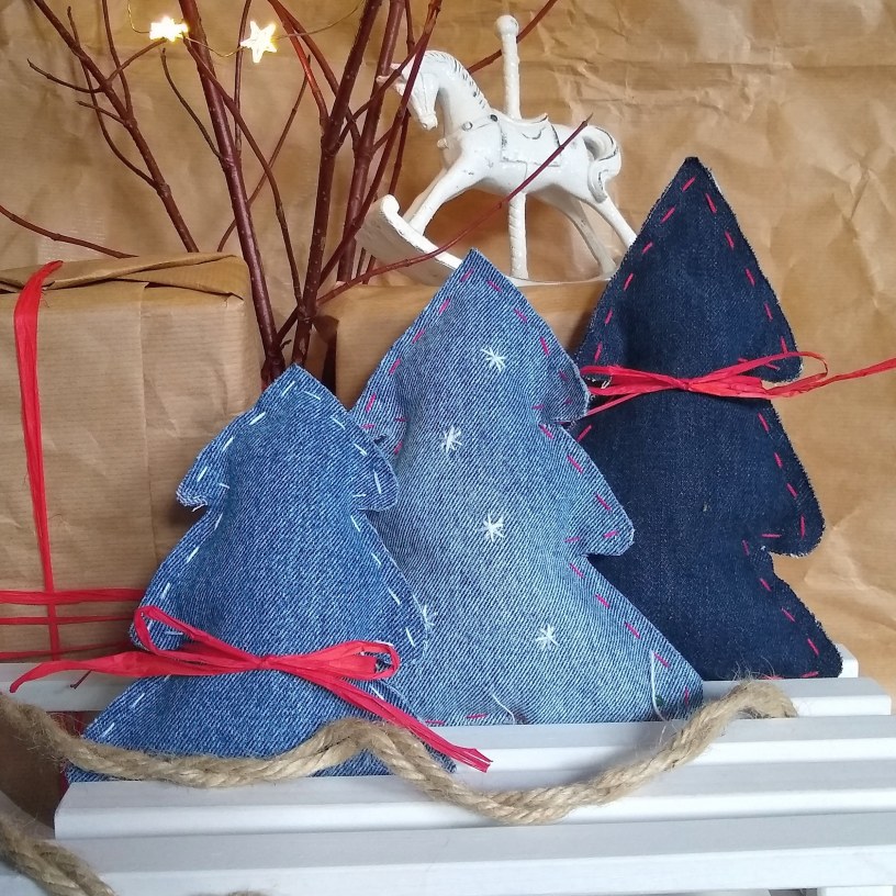 Denimowe choinki o różnych odcieniach, uszyte są z nogawek jeansów. Ręcznie zszyte, surowo wykończone, ozdobione prostym haftem w gwiazdki, idealnie pasują do industrialnego wnętrza typu loft.