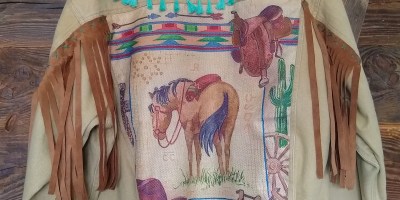 denim, farby akrylowe, tkanina, ubrania Denim jacket hand painted pop art czyli katana pędzlem malowana 21 lutego 2020